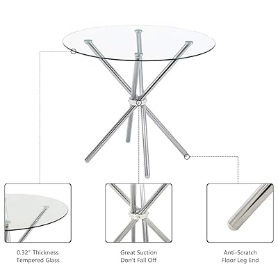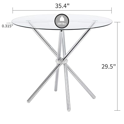 A presentable voguish dining table featuring a round flat base with small metal feet and a round top crafted of black tempered glass. Small round clear glass dining table and 4 faux chairs in cream set. Make a unique statement in your casual or modern dining room with this round glass table. You will like the way the chairs are close creating a good design. Table legs unscrew so that it reduces to six parts;